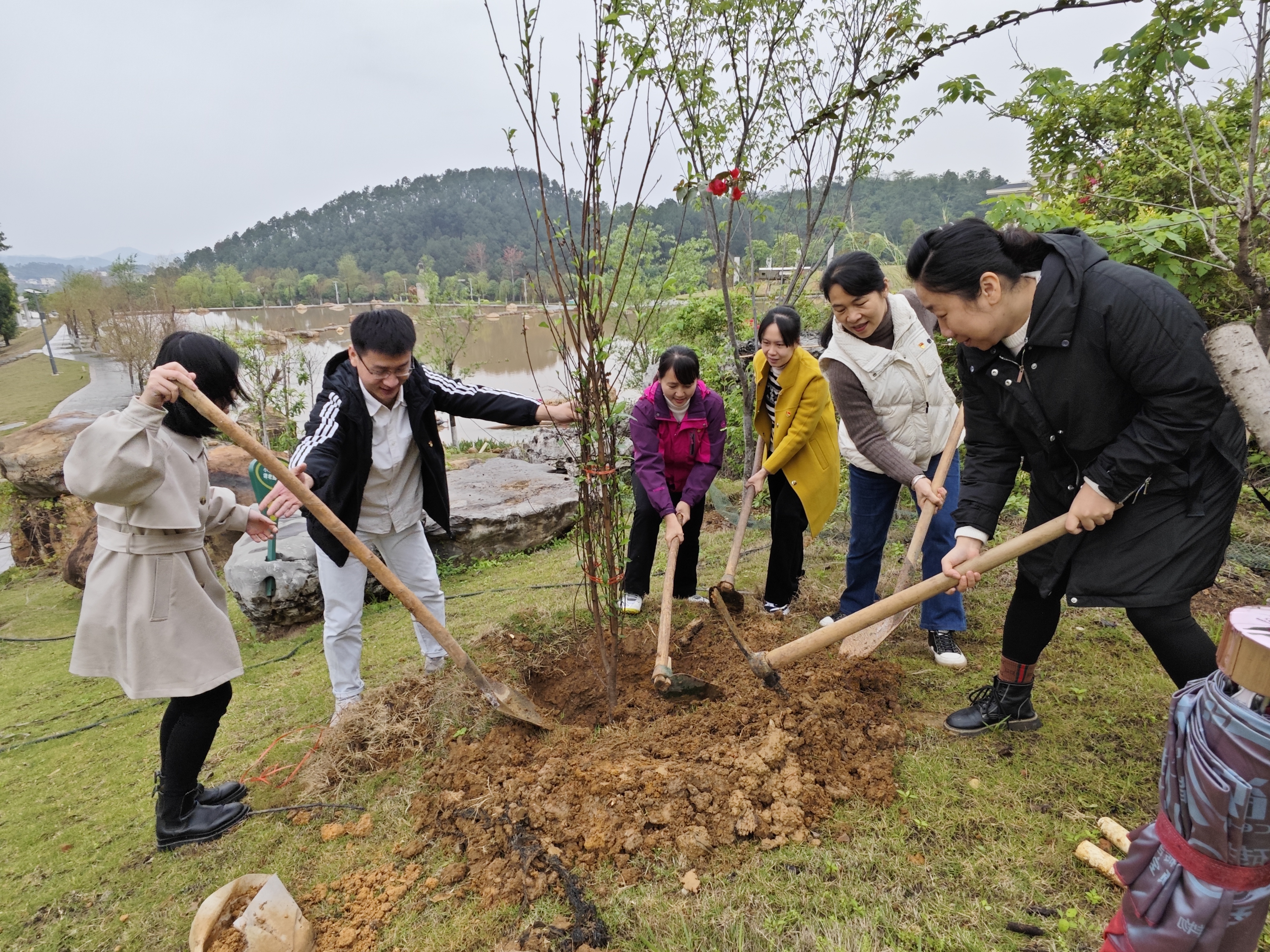 活动中,大家充满干劲、分工协作,搬运树苗、挥锄挖坑、扶苗围土、施肥浇灌,一棵棵新栽种的树苗笔直排列、迎风挺立。充分发扬了团结、互助、友爱的精神。