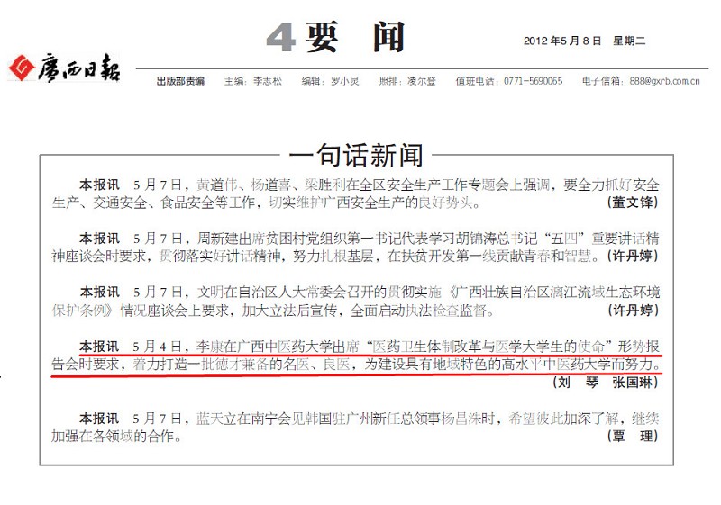 【广西日报】李康副主席出席我校“医药卫生体制改革与医学大学生的使命”形势报告会工作部署会 来源:宣传部 发布时间:2012-05-08 14:23:00 浏览次数: 次 【字体:小 大】 一句话新闻 本报讯 5月4日,李康在星空彩票老版本下载出席“医药卫生体制改革与医学大学生的使命”形势报告会工作部署会时要求,着力打造一批德才兼备的名医、良医,为建设具有地域特色的高水平中医药大学而努力。(刘 琴 张国琳) (http://gxrb.gxnews.com.cn/html/2012-05/08/content_679688.htm) 分享到: 【打印正文】