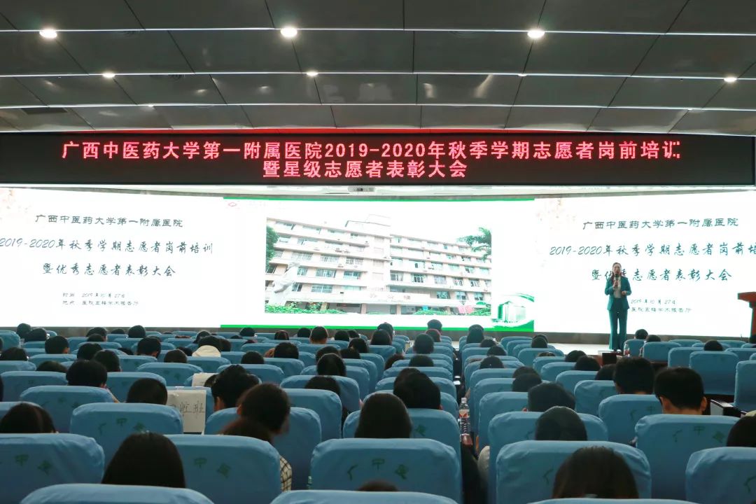 2019年10月27日下午,医院团委、社工部在东葛院区住院综合楼5楼多功能学术大厅举办2019年志愿者岗前培训暨星级志愿者表彰大会,来自第一临床医学院2016级、2017级新老志愿者共计400余人参加了本次活动。
