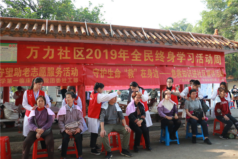 为以实际行动践行“不忘初心、牢记使命” 主题教育, 11月23日,教学党总支各支部联合机关第一、二党支部与团委、社工部在南宁市西乡塘区新阳街道万力社区开展“不忘初心、牢记使命”主题教育之 “全民健康宣教”志愿服务活动。此次活动各支部党员、青年志愿者共80余人参与,服务人数达100人,服务时长3小时。