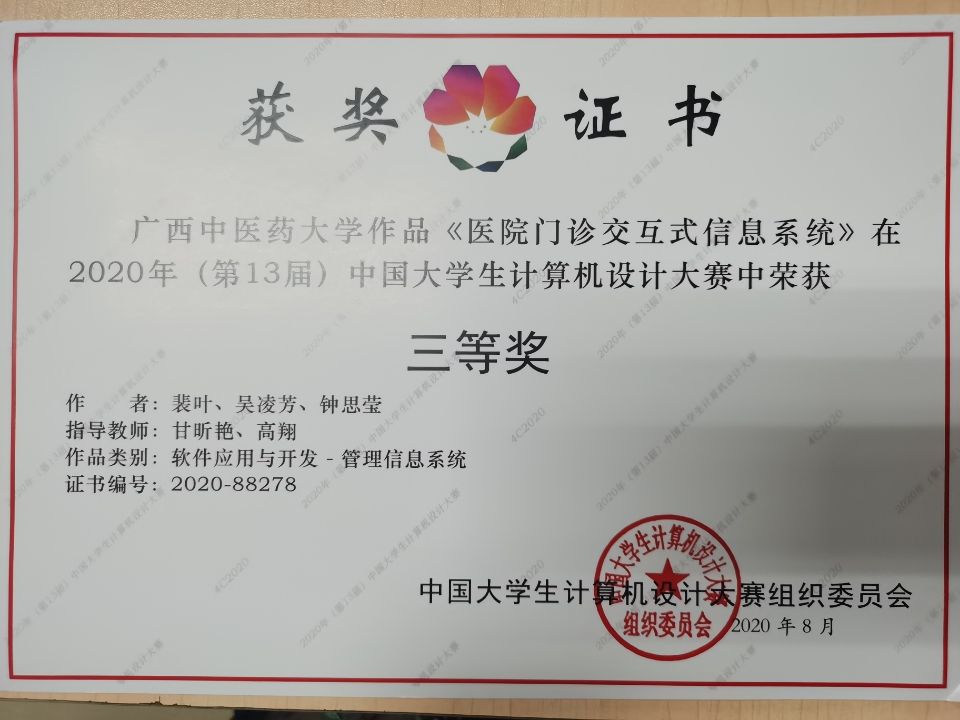 “中国大学生计算机设计大赛”(简称大赛)的宗旨是全面提高本科教学质量,切实提高计算机基础教学水平,激励大学生学习计算机知识、技术、技能的兴趣和潜能, 2020 年(第 13 届)中国大学生计算机设计大赛由中国大学生计算机设计大赛组织委员会主办,是国家官网公布的全国大学学科竞赛排行榜上的赛事之一。我校公共卫生与管理学院信息技术系积极组织学生参加比赛, 2017 级信息管理与信息系统专业学生裴叶、吴凌芳和钟思莹团队,在本次大赛中获得三等奖,进一步展示了我校学子的风采。