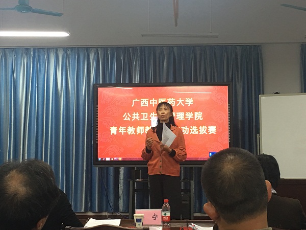 11月23日公共卫生与管理学院开展了2018年学校教师基本功赛公管学院预选赛,我系的唐晓年教师参赛,唐老师赛前准备充分,精心设计各个教学环节。赛后,专家评委分别就教案讲稿、内容设计、课件制作、板书运用、语言教态、授课内容等方面作了精彩点评,为青年教师今后教学提出宝贵的意见和建议。参与比赛和观摩学习的各位教师表示受益匪浅。