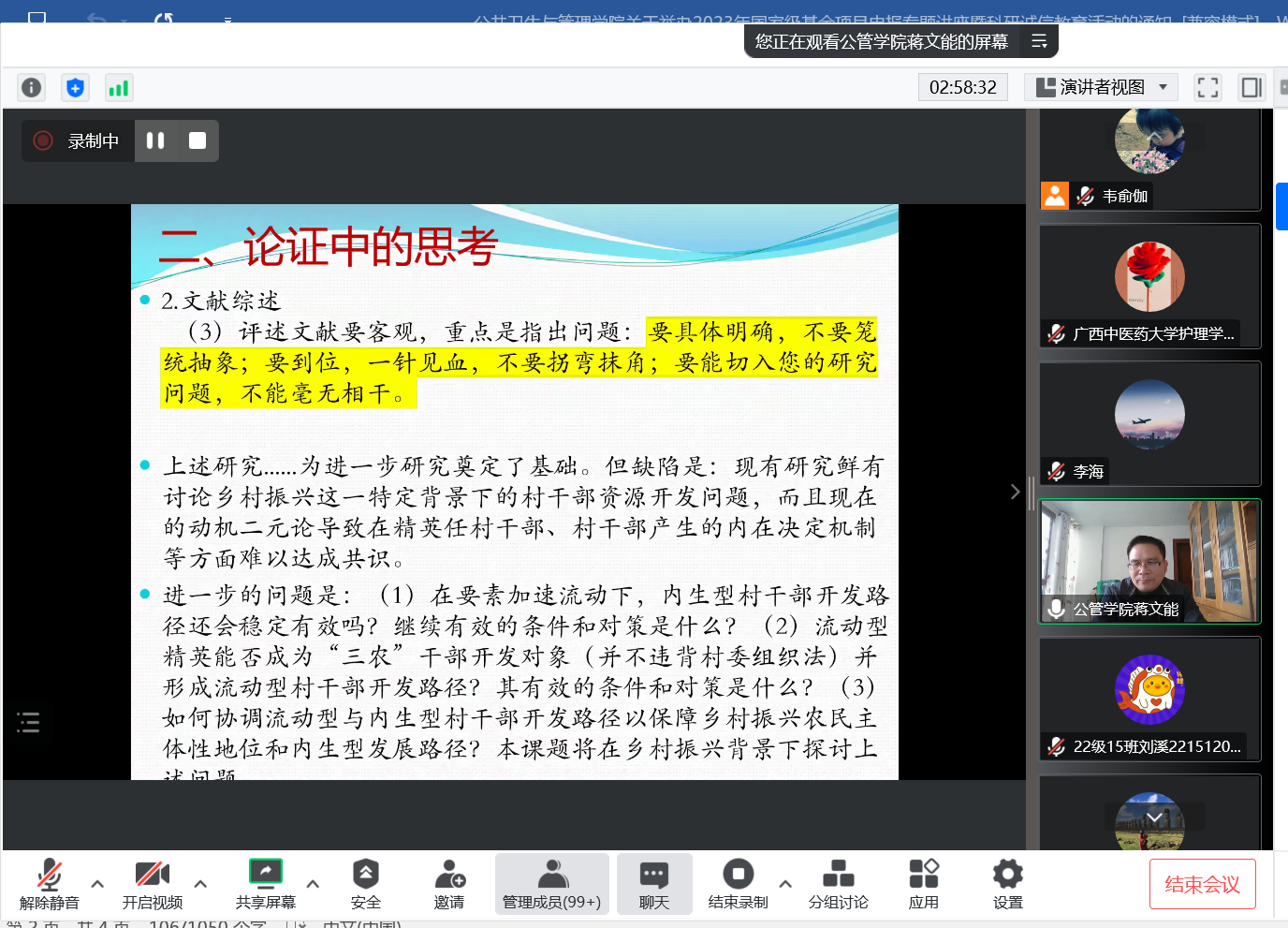 首先,周晓莹博士以自己主持国家自然科学基金3项,广西自然科学基金2项的宝贵经验做《青年教师申请NSFC需要做哪些准备?》的第一场主题讲座,她介绍了自己在申请国家自然科学基金中的感想与经验,并鼓励青年教师敢于探索未知领域,沉下心做研究,不要害怕失败,从失败中不断总结经验;同时撰写基金申报书时要多向身边的人请教,方能完善申报书,取得成功。第二场讲座邀请我院主持国家社科基金项目2项,横向课题20余项,多次获得广西壮族自治区社会科学优秀成果奖二等奖、三等奖的蒋文能博士做《国家社会科学基金申报中我思考了什么?》的主题讲座,他向广大教师介绍了申报国家社会科学基金的经验,并无私的传授自己多年的申报技巧,如何解读申报指南,并与自己的研究方向相结合等实用的经验。整场讲座参会人数近200人,讲座的知识性、专业性和趣味性强,深受老师们的喜爱,会后教师们与专家进行了线上交流,表示受益匪浅。讲座取得圆满成功。
