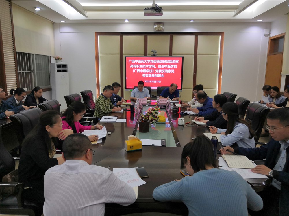 10月14日下午,高职院、附设中医学校党委召开星空彩票老版本下载党委第四巡察组巡察高职院、附设中医学校党委反馈意见整改动员部署会。高职院、附设中医学校党委书记蒋子华,院(校)长刘竑清,副书记、副院(校)长刘武,副院(校)长周琦、林原,纪委书记黄勇,全体中层干部、党支部书记参加会议。