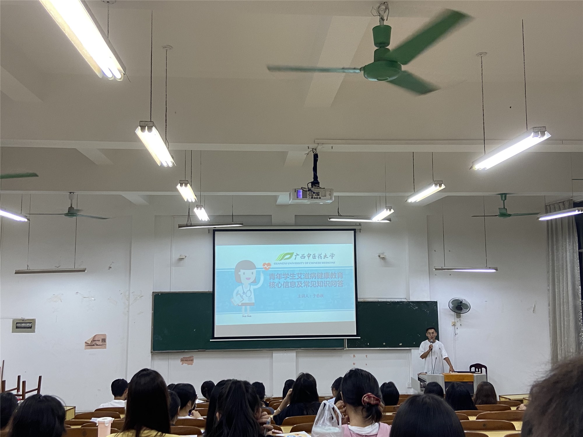 为 强化艾滋病警示性宣传教育,提高大学生自我防范意识 。高等职业技术学院全体新生辅导员:林梓约、吴静思、肖翔、于春秋、叶毅,在 11月 对 约600名 新生分班次开展了大学生 艾滋病防护知识讲座。
