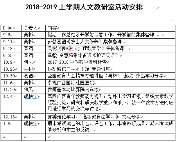 根据护理学院对教研室工作的要求,进一步深化教学改革,创新教学手段,更新教育理念,强化教学管理,全面提升人才培养质量。以教学工作要点为指南,在健全教研室管理制度基础上提升教师教学科研能力,完善各项教学工作,促进教学工作进一步向规范化、科学化、内涵化方向发展。根据工作实际,为使工作有序、按时完成达到预期目标,提高星空网页游戏官网质量,特定此计划。
