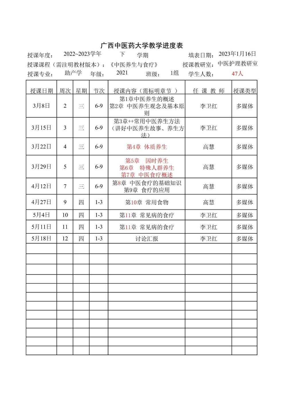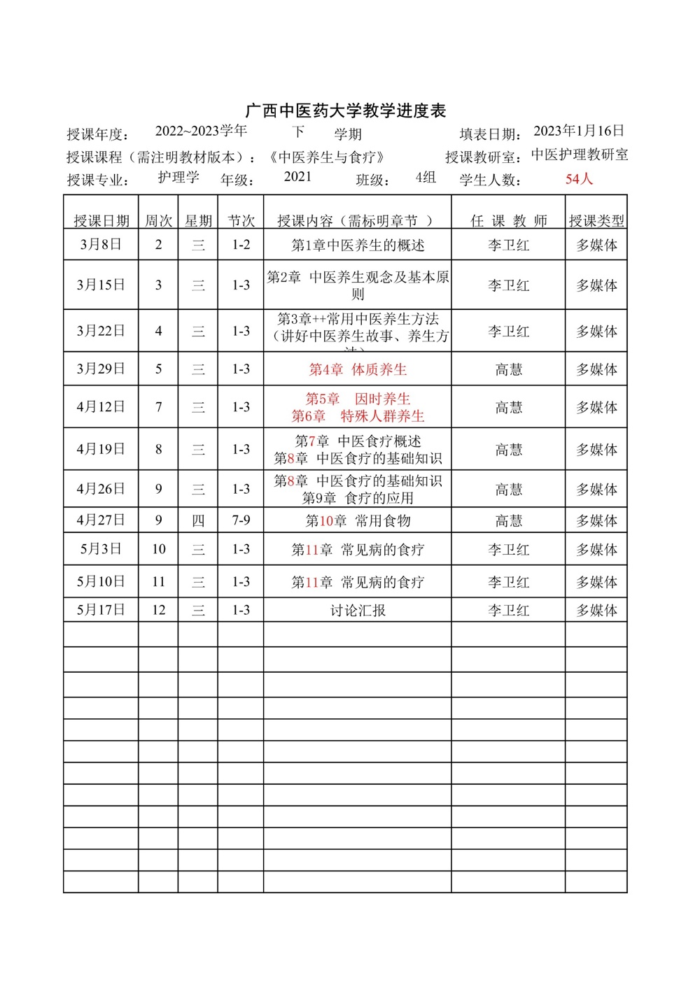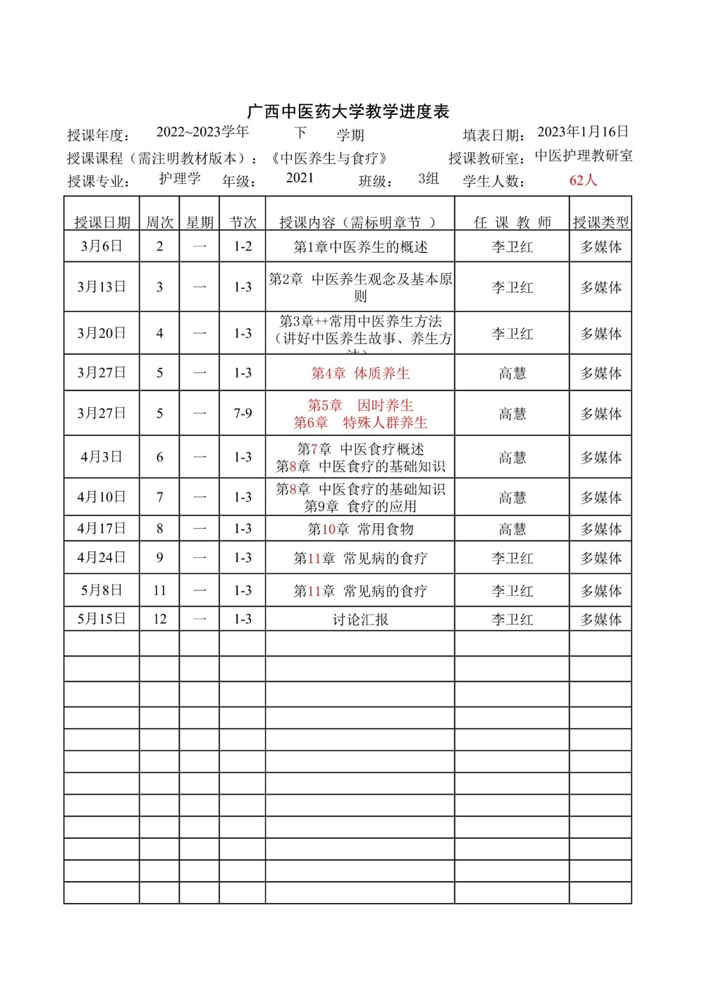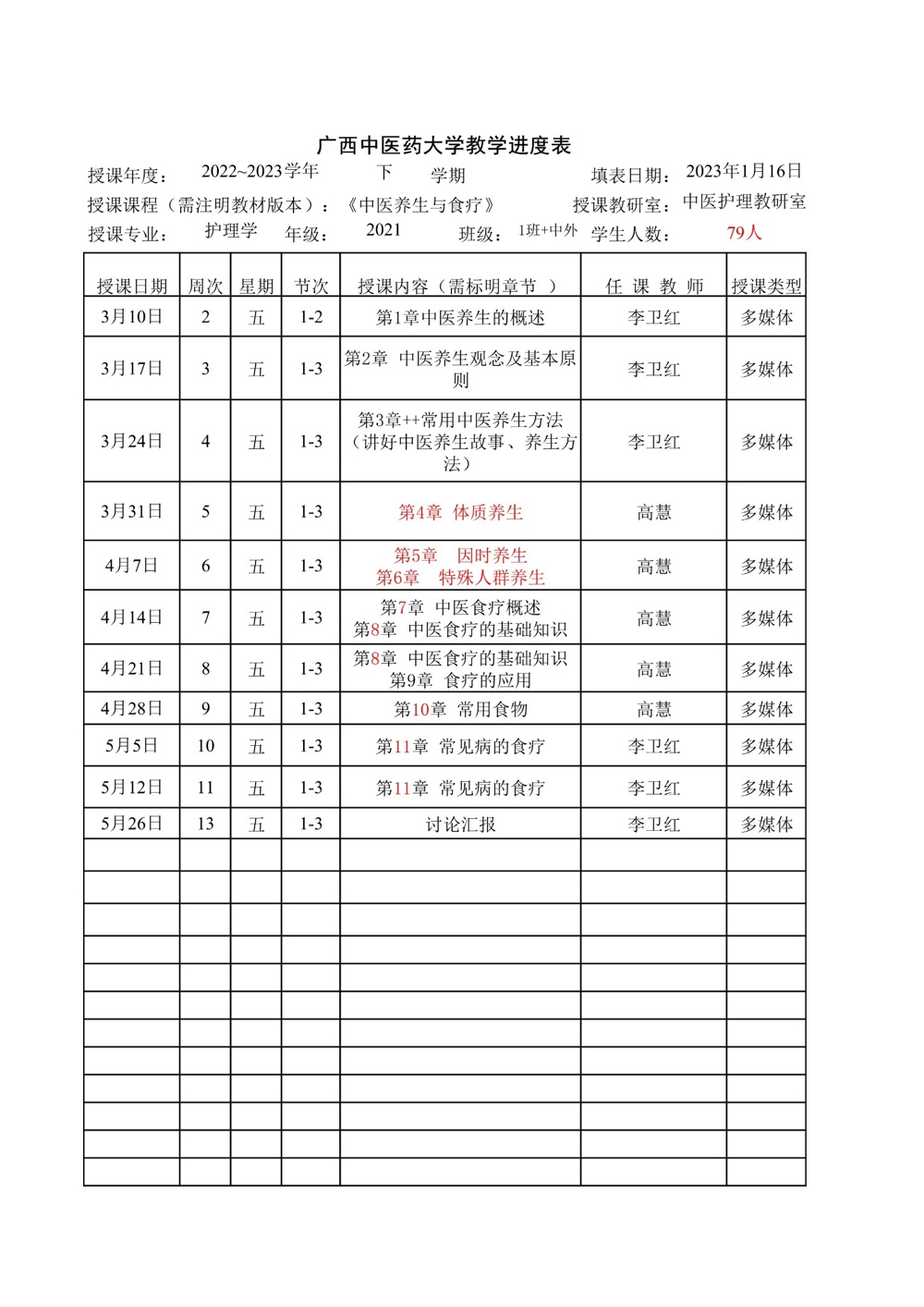 2022-2023学年下学期中医护理教研室教学进度表