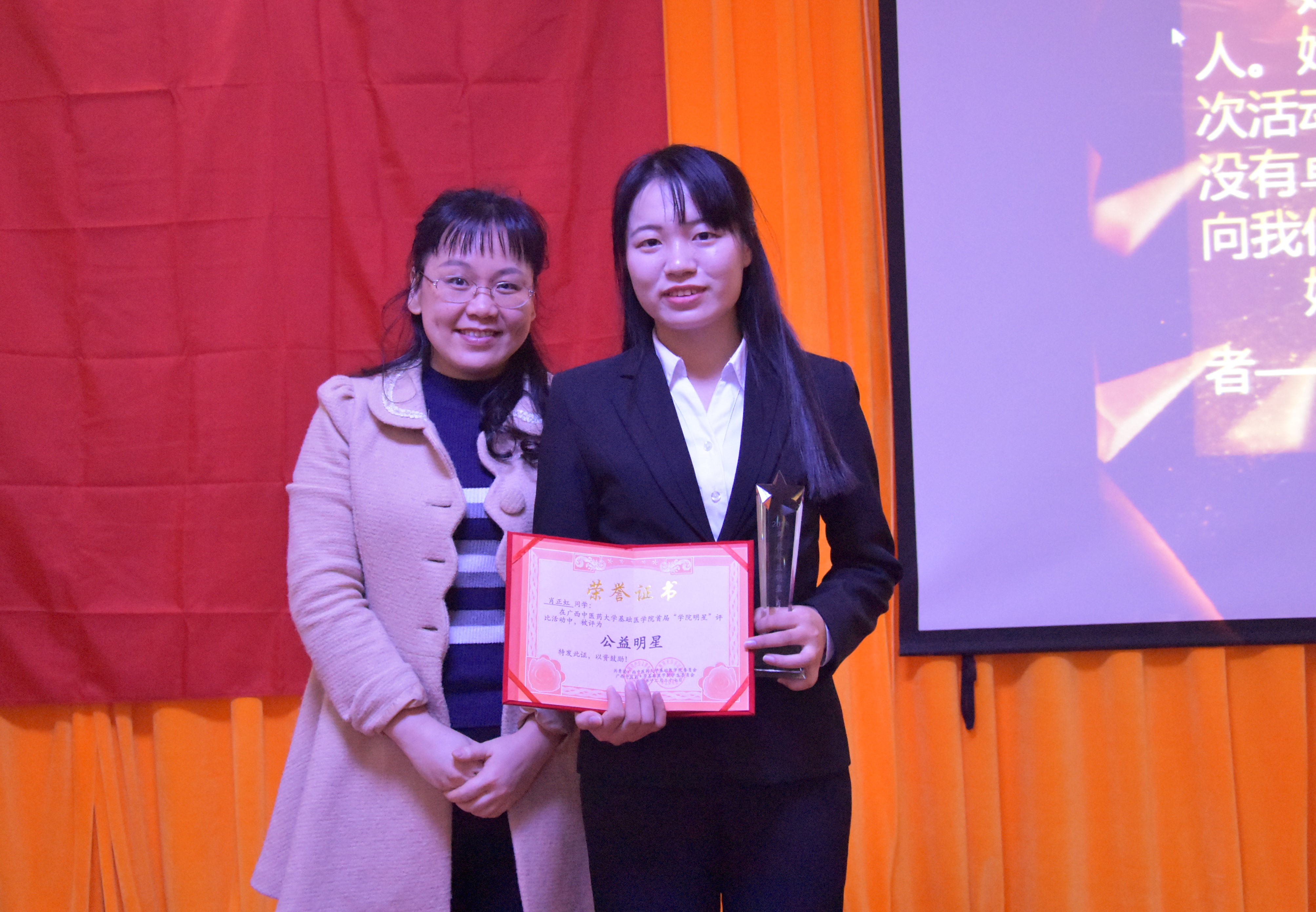 本次颁奖盛典以“青春筑梦”为主题,用生动视频、细腻的讲述、真切对话,向师生全方位呈现我院优秀学子的朝气蓬勃。“十大学院明星”分别有成绩优秀,勤奋刻苦的学习明星丁欣瑶;活力四射,乐于助人的公益明星肖正虹;绽放青春、激情向上的运动明星朱森林;风采奕奕,璀璨闪耀的才艺明星林思吟;以身作则,热情肯干的服务明星张善枝;天道酬勤,自强不自的励志明星庞翠英;乐于奉献,传递爱心的感动明星饶亚平;热爱中医,勤学好问的技能明星刘君坤;善于思考,敢于实践的科研明星蒋颖心;携手并肩,团结齐心的团队明星17临床1班班委。一段段生动感人的视频多角度展现了这些学院明星的成长之路,一句句感人肺腑的颁奖词感染者在场每一个人,这些青年楷模将激励着基础医学院全体学子不断前行。基础医学院林江院长、龙春莉副书记等分别为我院首届十大“学院明星”颁奖。