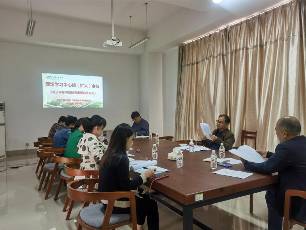 10月19日,基础医学院党委书记龚名师主持召开党委中心组学习(扩大)会议,专题学习《习近平总书记教育重要论述讲义》导言部分和《习近平总书记关于中医药重要论述汇编》等内容。