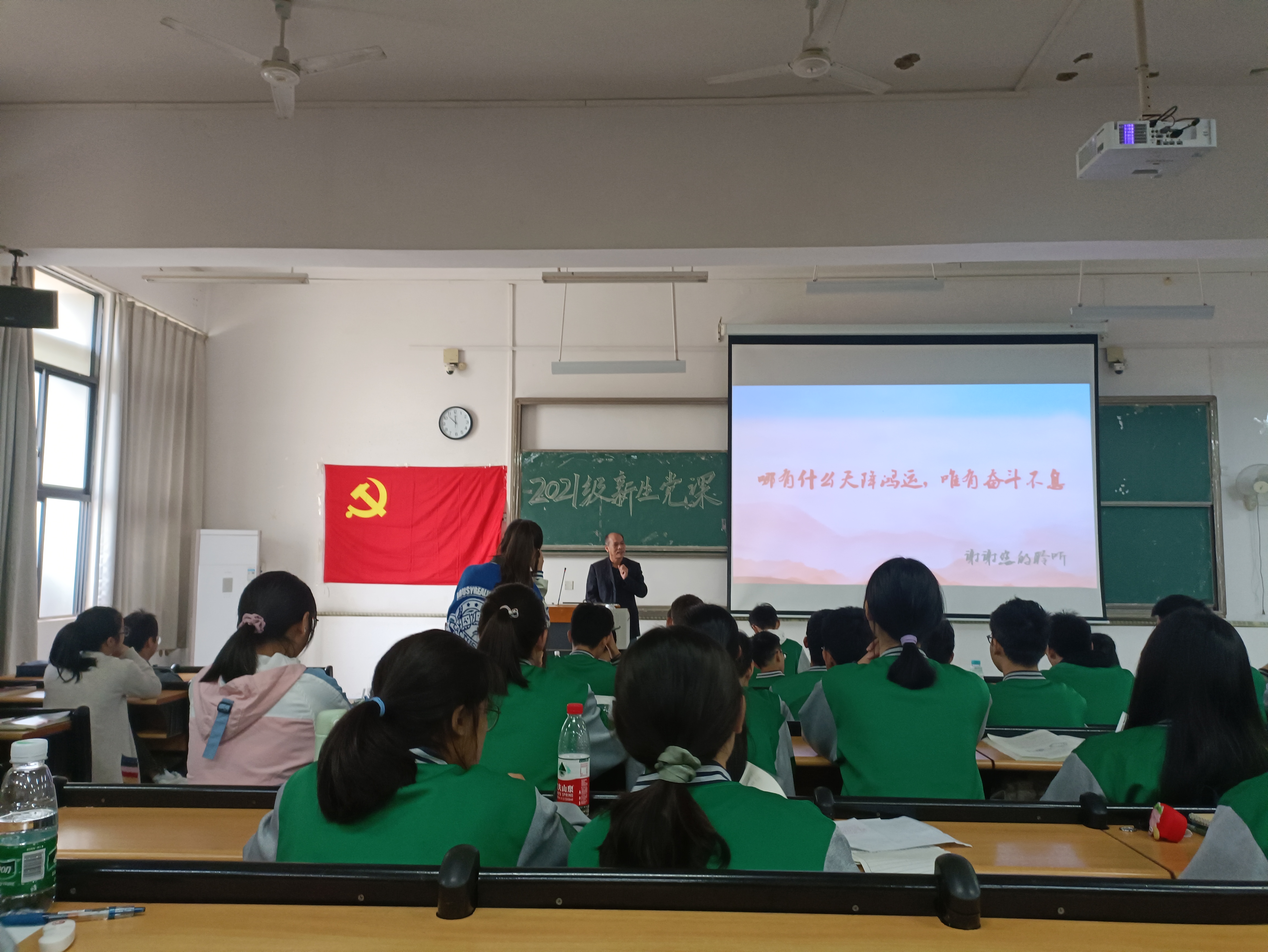 课上,龚名师结合生动事例回顾了中国共产党在新民主主义革命、社会主义革命和建设、改革开放和社会主义现代化建设、新时代中国特色社会主义四个历史时期的光辉历程,系统总结了党在百年奋斗中积累的宝贵经验和实践启示,深刻阐明了“中国共产党是一个什么样的党”。他强调,“两个一百年”奋斗目标与大学生的成长成才紧密相连,它为当代大学生提供了施展才华的大好机遇和广阔空间。在我们向着第二个百年奋斗目标迈进的新征程中,大学生的成长成才与党的发展、国家的发展是同步同向同行的。他激励全体新生,要永葆初心接续奋斗,用实际行动践行“请党放心、强国有我”的青春誓言,积极向党组织靠拢,在新的历史征程上践行当代青年的新使命,为实现中华民族伟大复兴贡献力量。