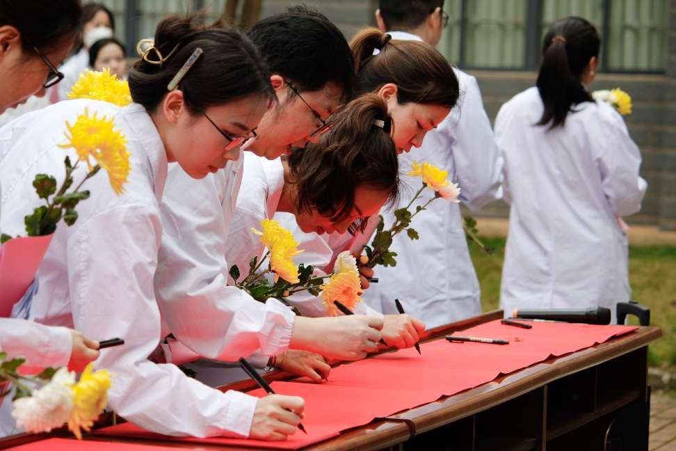 师生们手持菊花,依次整齐地站立在位于致和楼前的实验动物纪念碑旁默哀一分钟,将手中的鲜花轻轻地放在碑前,并在活动纪念册上庄重的签下自己的名字,以此表达对实验动物的尊重,感恩实验动物为生命科学发展做出的贡献。