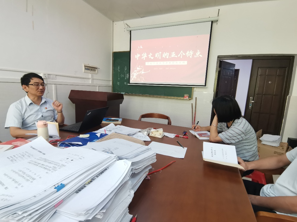 为贯彻落实学院党委关于认真开展学习贯彻习近平新时代中国特色社会主义思想主题教育工作的要求和学习计划,6月6日,基础医学院教工第七党支部召开支部党员大会,支部书记伍冠一同志主持会议,并以《中华文明的五个特点》为题,以微党课的形式向大家讲解了中华文明的五个特点以及“两个结合”等相关内容,带领大家认真学习了习近平总书记在文化传承发展座谈会上的重要讲话精神。
