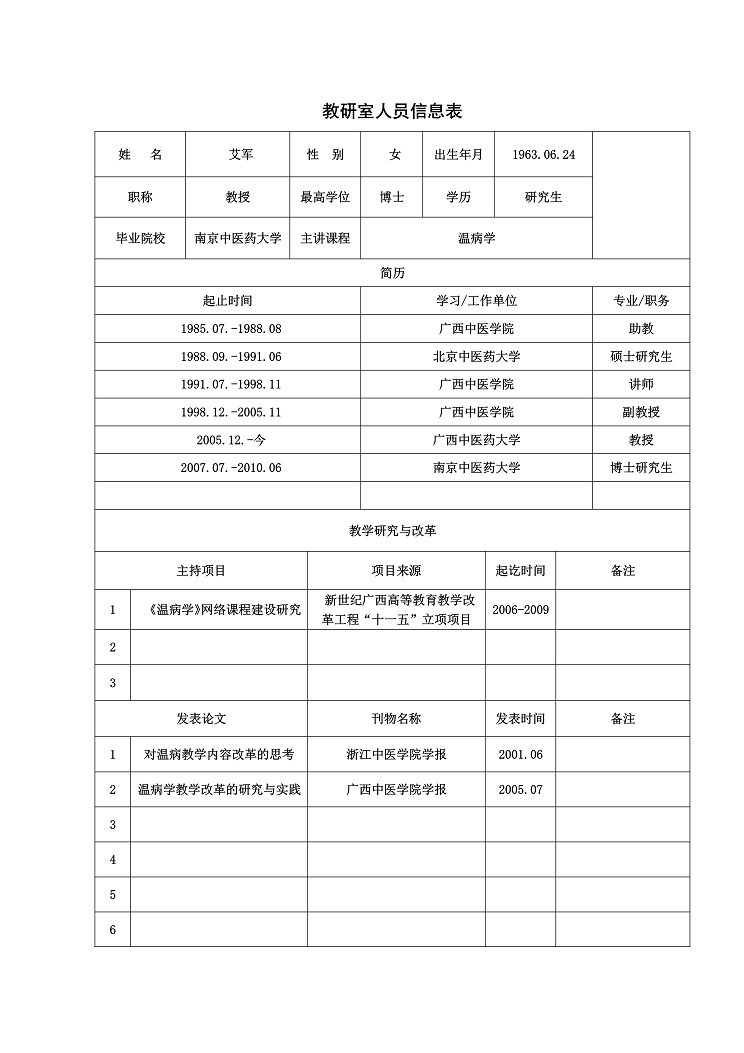 艾军,女,1963年生,医学博士,教授,主任医师,博士研究生导师,广西名中医,星空彩票老版本下载中医临床基础学科学科带头人,中华中医药学会感染病分会名誉副主任委员,中华中医药学会名医学术思想研究分会常务委员,世界中医药学会联合会儿科专业委员会常务委员,广西中医药学会理事。