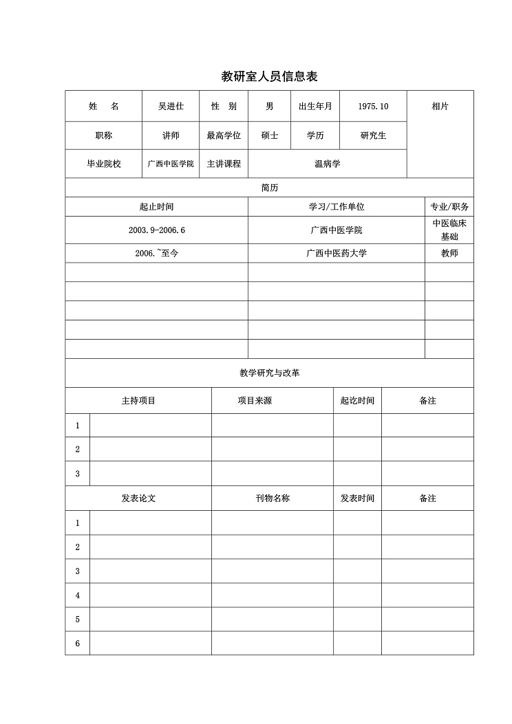 从事中医温病学教学、临床和科研工作20余年,自1999年7月至2003年8月在从事临床实践工作,2003年9月至2006年6于在星空彩票老版本下载师从三代御医之传人艾军教授、博士生导师,攻读硕士研究生,获医学硕士学位,2006年7月至今在广西中医大学温病学教研室历任助教、讲师。主要研究方向温病热郁瘀相关病机理论与临床研究。创新擅长融会贯通把内经、伤寒论、温病学等中医经典融为一炉进行教学工作;并把温病理论运用到临床实践中。主持校级科研课题2项,公开发表学术论文10余篇。