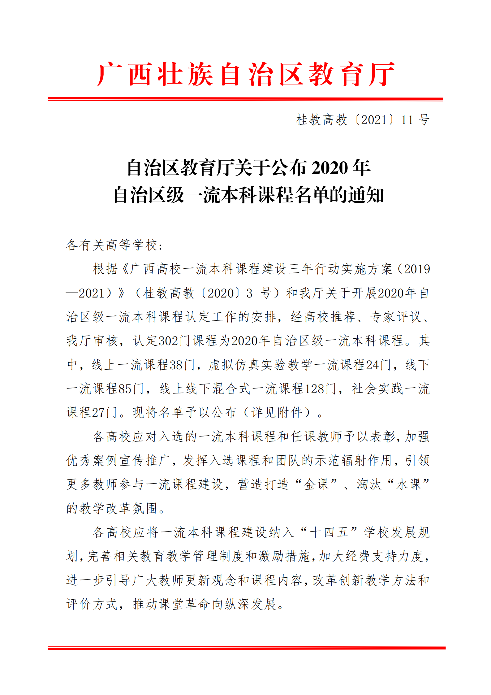 《医古文》课程获评自治区级一流本科线下课程 来源:本站原创 作者:医古文教研室 发布时间:2021-12-07 15:25:25 浏览次数: 次 【字体:小 大】 根据《广西高校一流本科课程建设三年行动实施方案(2019-2021)》(桂教高教[2020]3号)和自治区教育厅关于开展2020年自治区级一流本科课程认定工作的安排,经高校推荐、专家评议、自治区教育厅审核,认定302门课程为2020年自治区级一流本科课程。其中我教研室《医古文》课程被认定为线下一流课程。自治区教育厅关于公布自治区级一流本科课程名单的通知及附件(扫描件) 分享到: 【打印正文】