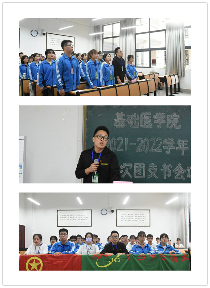 会议开始,全体起立高唱《中国共青团团歌》。首先,会议对荣获2020-2021学年基础医学院“活力团支部”和“优秀团支书”进行表彰,同时优秀团支书代表进行工作经验分享。然后,和卫宾老师分别从高校团支部建设重要性、本学期基础医学院团支部工作重点和方向、团支书工作职责和工作方法三个内容,结合相关案例对各个团支书进行培训;同时和卫宾老师对我院团支部考核和“活力团支部”评选相关内容和要求进行详细讲解。最后,基础医学院团委组织部主要负责人对本学期推优工作、团费收缴和管理、团日活动以及团支部“三会一课”等具体工作进行布置,同时对各个团支书提出的具体问题进行解答。