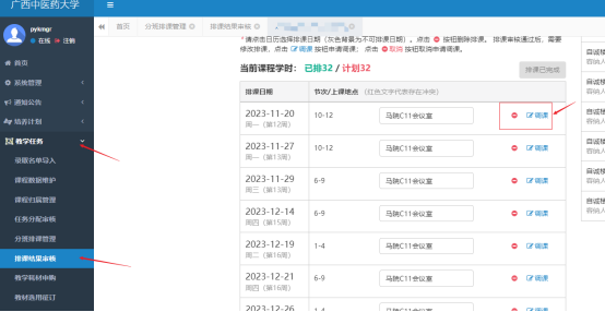 4、 排课人进入研究生管理系统——教学任务——排课结果审核——选择相应课程点击排课——在需要调课的时间后面点击“调课”按钮——选择调整后的日期、节次和教室