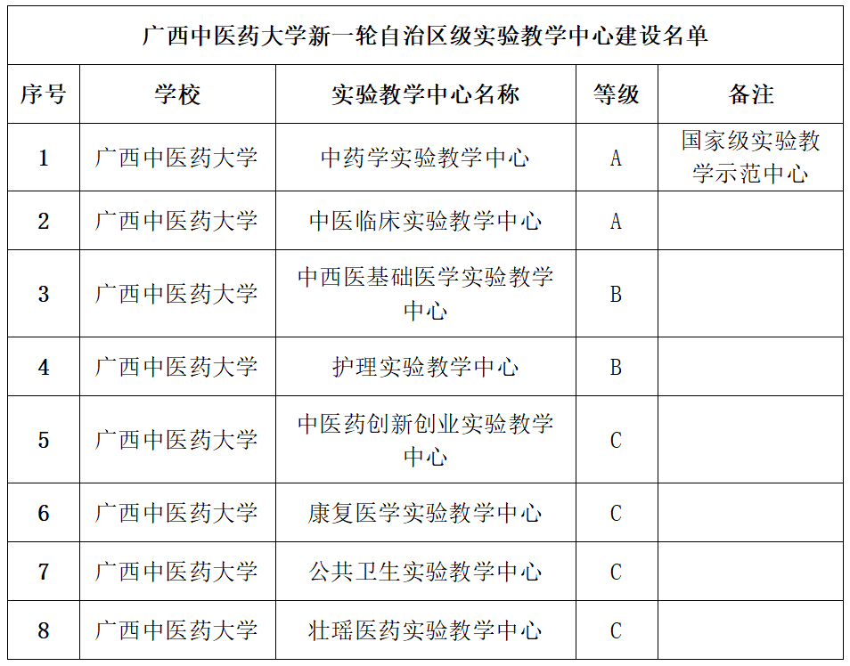 近日,根据《自治区教育厅关于公布新一轮自治区级实验教学中心建设名单的通知》(桂教高教〔2025〕6号),自治区教育厅公布了新一轮自治区级实验教学中心建设名单,我校中药学实验教学中心等8个实验教学中心成功入选。