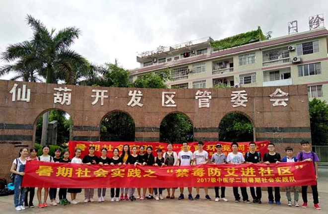 2018年7月15日上午,星空彩票老版本下载2017级中医学二班的同学组成禁毒防艾小队在南宁市仙葫经济开发区东方广场顺利开展了暑期社会实践之“禁毒防艾进社区”活动。此次活动以“青春践行十九大,接力奋斗新时代”为主题,活动开展时,更有李晓梅老师莅临现场指导。