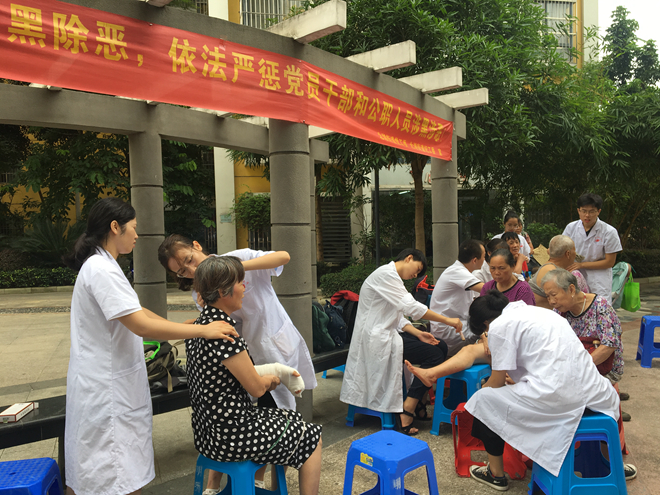 2019年7月13日上午08:00,2016级中医学二班西伯利亚狼实践队21名同学,在星空彩票老版本下载明秀校区汤歌苑集合,在王佳林老师及负责人的集合讲话之后,同学们就前往目的地—广西南宁市明秀南社区惠众社会工作服务中心。在进行了场地的布置之后,我们便开始了义诊活动。义诊活动共分为三个版块,第一是量血压,在这个区域,同学们为居民测量血压之后,并介绍相关防治知识,而后引领群众去另外的两个区域。第二个区域是艾灸,第三个区域是手法推拿。在艾灸与手法推拿区域,同学们与群众积极艾灸及手法推拿,并与其沟通,宣讲相关医学知识,为居民们带来了福祉。本次活动,同学们也收获了很多,锻炼了自身的技能,也服务了群众,可谓是一举两得。同学们也必定会在将来的学习生活中,更加勤奋学习,以更好地服务人民群众。在今天的活动结束之后,老师同学们会同社区负责人进行合影留念!