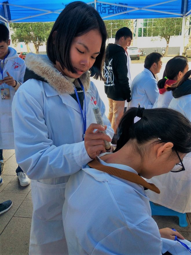 本次义诊还有拔火罐、刮痧和针刺等项目,也同样得到了同学们的欢迎。