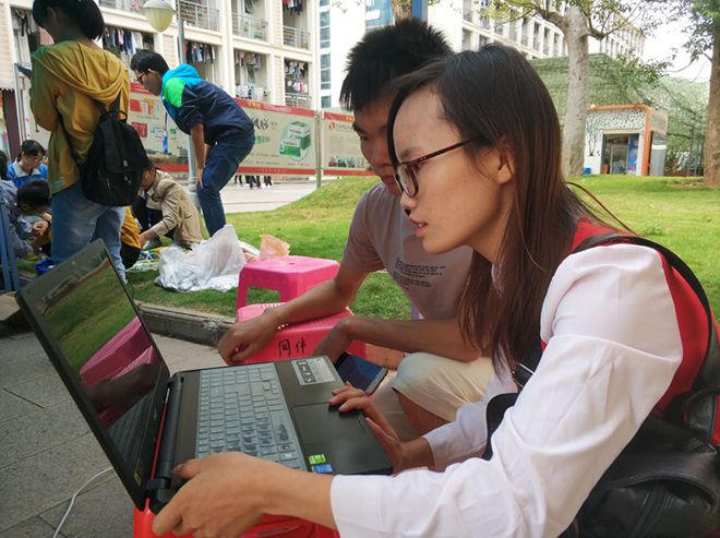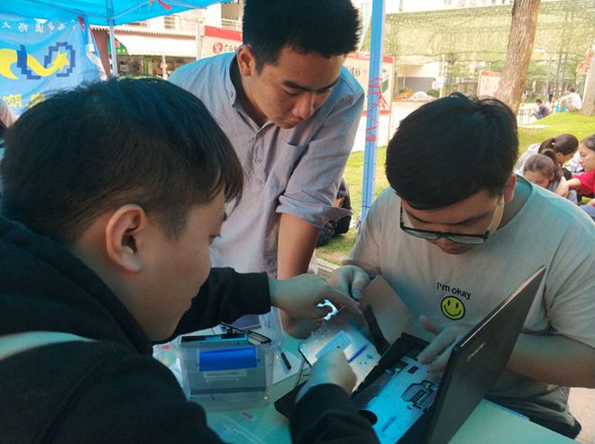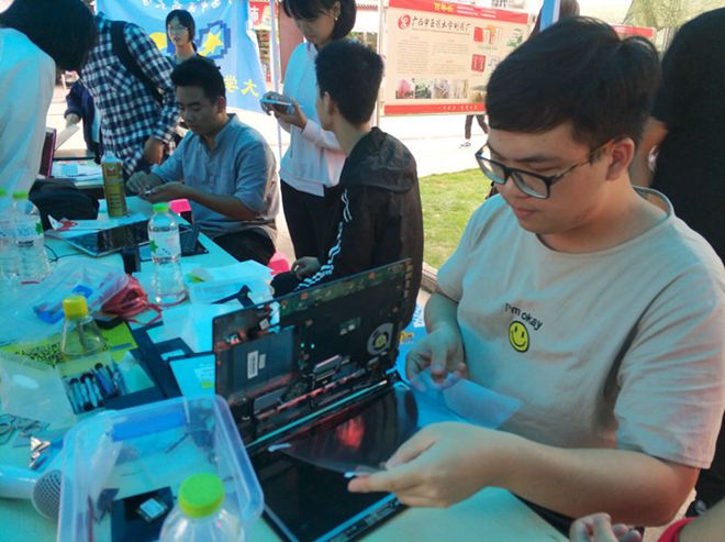 早上,各项工作准备就绪,活动正式开始。活动过程中,电协的小伙伴们分工明确,工作井然有序。有在校园里热情地介绍活动,吸引同学;有耐心地引导同学们登记编号,以保证工作的有序进行。有认真地给同学们的电脑进行维修,并将检修好的电脑按序号存放,妥善保管。免费贴手机膜、精美的礼品引得同学们驻足,前来维修的同学也络绎不绝。活动进行得有条不紊,现场气氛活跃。