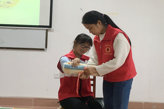 随后,讲师利用多媒体向广西外国语学院的学生讲解了止血与包扎的专业知识并亲自演示了止血与包扎的具体操作,确保每一位同学都能听懂、看懂。