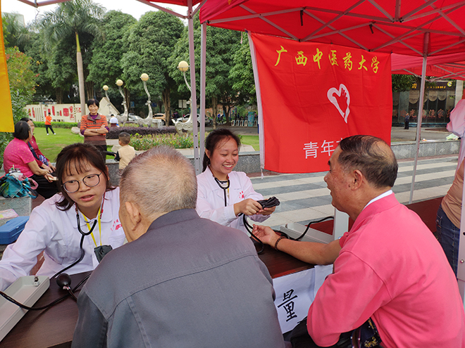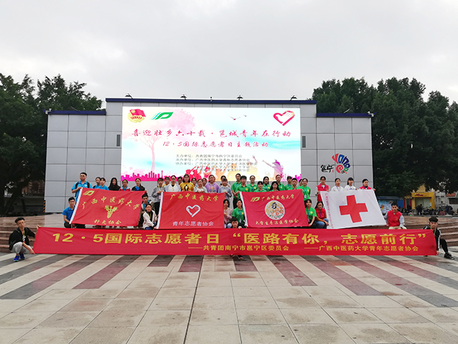 志愿服务源于心,献出爱心在于行,为了迎接12月5日国际志愿者日的到来,2018年12月2日,由共青团南宁市邕宁区委员会主办,我校青年志愿者协会承办,联合我校大学生手法医学协会、针灸协会和红十字会在邕宁区新兴广场开展了以“医路有你,志愿前行”为主题的义诊活动。