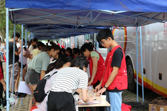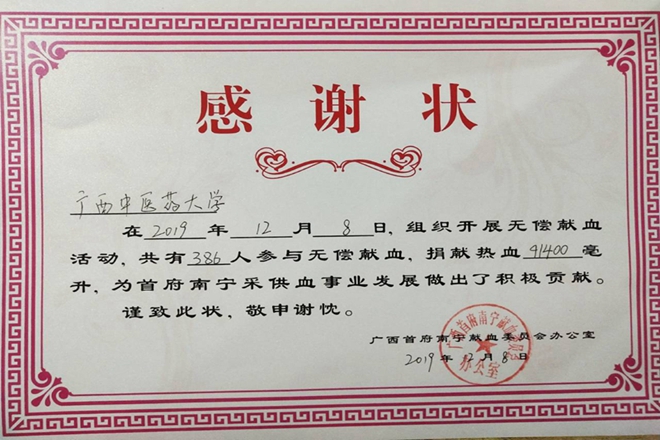 据了解,2019年我校(两校区合计)共举行六次无偿献血活动,献血人数共计2063人,总献血量达505950毫升,为补充南宁市血库用血做出了贡献。