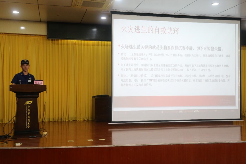 青秀区消防大队陶海健一行在仙葫校区图书馆二楼第二会议室为学校本部尚未参加过消防安全培训的教职工、新同学、各实验室老师、五和食堂员工、校内商铺工作人员及部分赛恩斯新医药学院学生进行消防安全知识培训。随后,在壮瑶医教学实验实训楼一楼大厅开展了应急疏散逃生演练、灭火器实际操作培训。