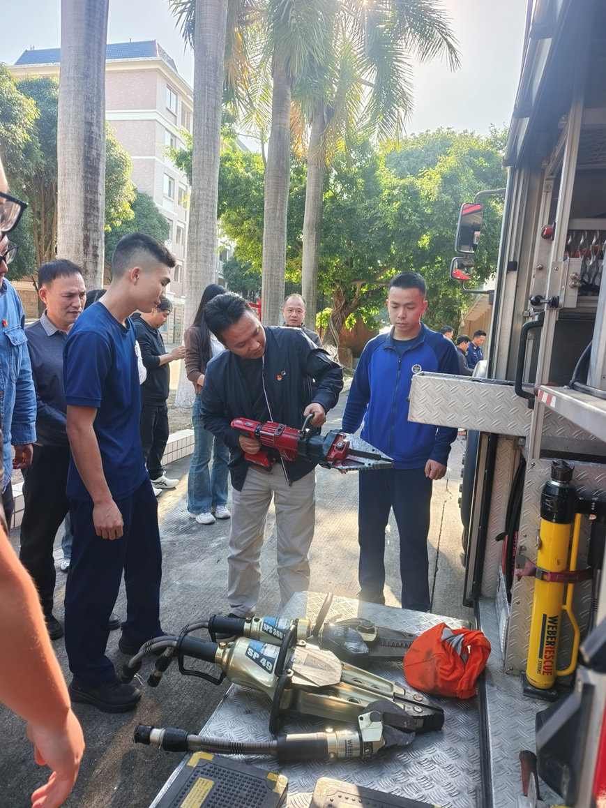 随后,党员们沉浸式参观消防装备展示区,体验防护服穿戴、学习救援绳索结扣技巧。消防指战员结合实战案例,详细介绍液压破拆工具组、登高平台消防车等装备的操作原理与应用场景,展现消防救援工作的专业性与使命感。