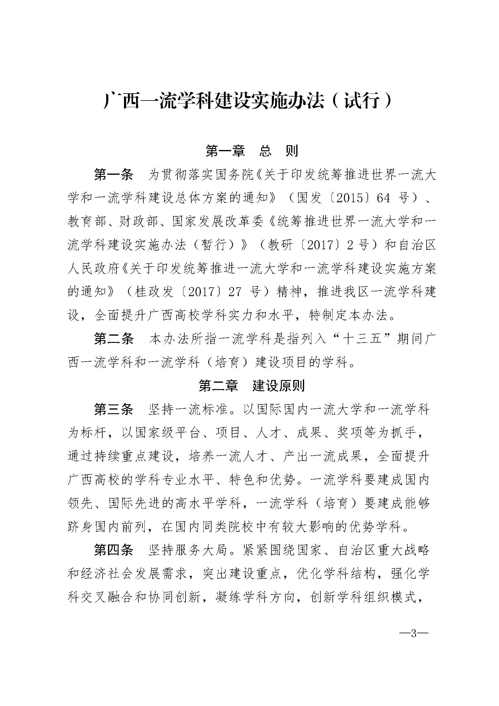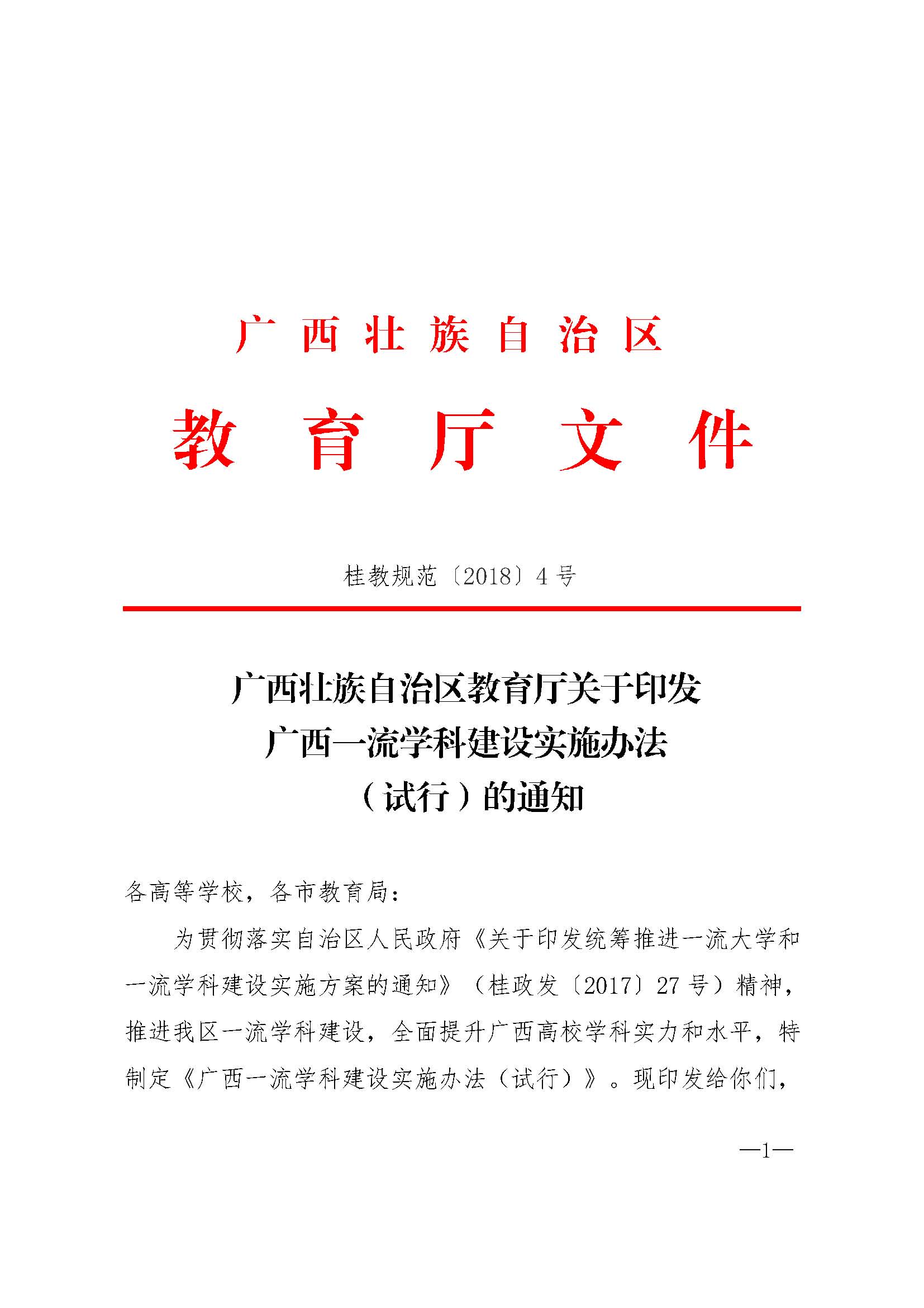 广西壮族自治区教育厅关于印发广西一流学科建设实施办法(试行)的通知(桂教规范〔2018〕4号) 发布时间:2018-07-16 17:57:50 浏览次数: 次 【字体:小 大】 分享到: 【打印正文】