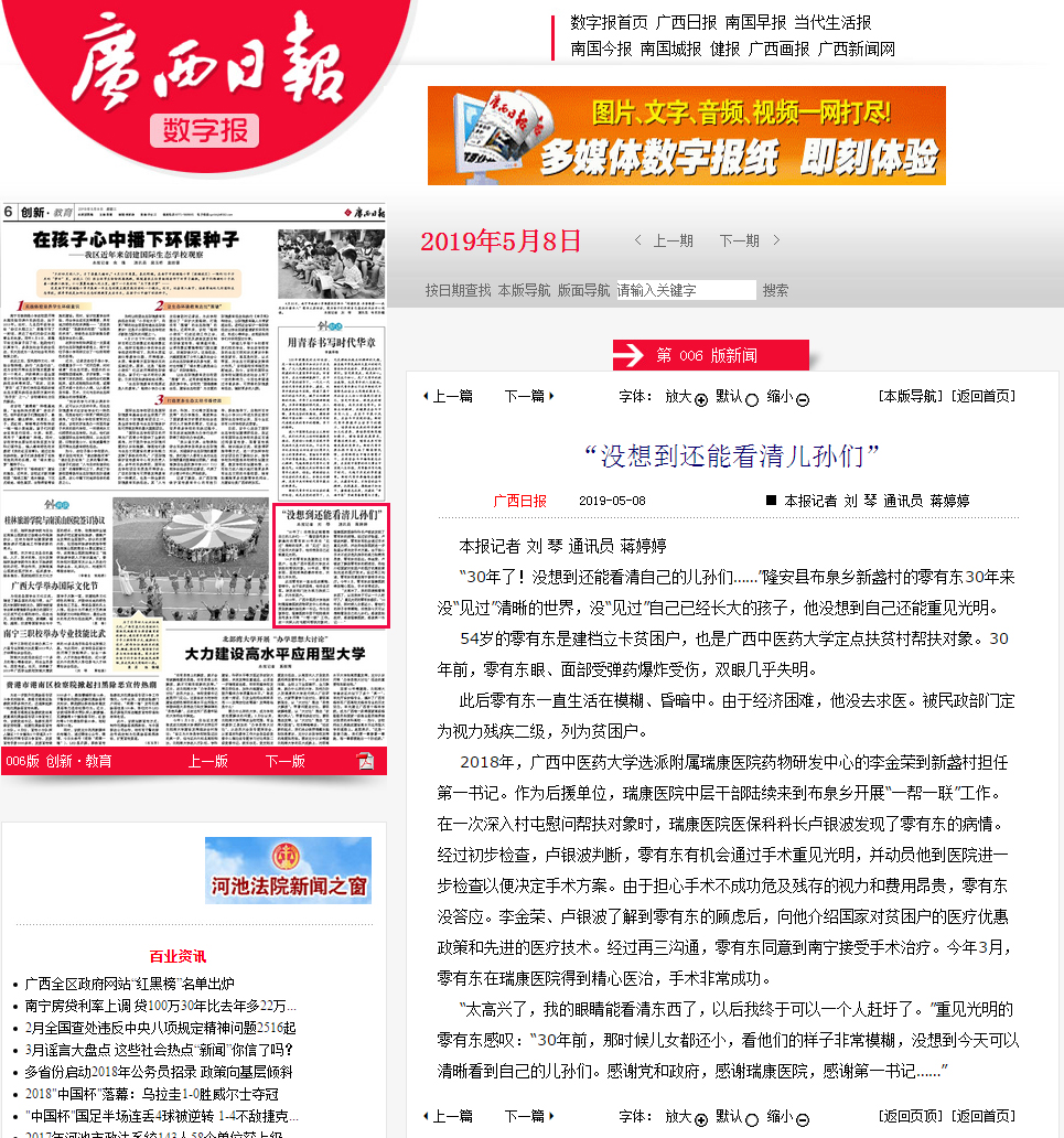 2018年,星空彩票老版本下载选派附属瑞康医院药物研发中心的李金荣到新盏村担任第一书记。作为后援单位,瑞康医院中层干部陆续来到布泉乡开展“一帮一联”工作。在一次深入村屯慰问帮扶对象时,瑞康医院医保科科长卢银波发现了零有东的病情。经过初步检查,卢银波判断,零有东有机会通过手术重见光明,并动员他到医院进一步检查以便决定手术方案。由于担心手术不成功危及残存的视力和费用昂贵,零有东没答应。李金荣、卢银波了解到零有东的顾虑后,向他介绍国家对贫困户的医疗优惠政策和先进的医疗技术。经过再三沟通,零有东同意到南宁接受手术治疗。今年3月,零有东在瑞康医院得到精心医治,手术非常成功。