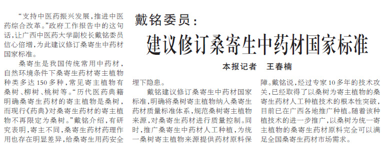 戴铭建议修订桑寄生中药材国家标准,明确将桑树寄主植物纳入桑寄生药材质量标准体系,规范桑树寄主植物来源,对桑寄生药材进行质量控制。同时,推广桑寄生中药材人工种植,为统一桑树寄主植物来源提供药材原料保障。戴铭说,经过专家10多年的技术攻关,已经取得了以桑树为寄主植物的桑寄生药材人工种植技术的根本性突破,目前已在广西各地推广种植。随着该种植技术的进一步推广,以桑树为统一寄主植物的桑寄生药材原料完全可以满足全国桑寄生药材市场需求。