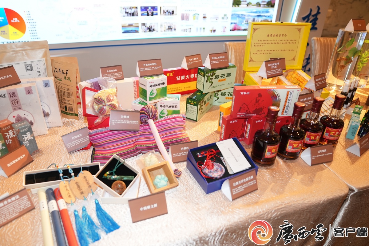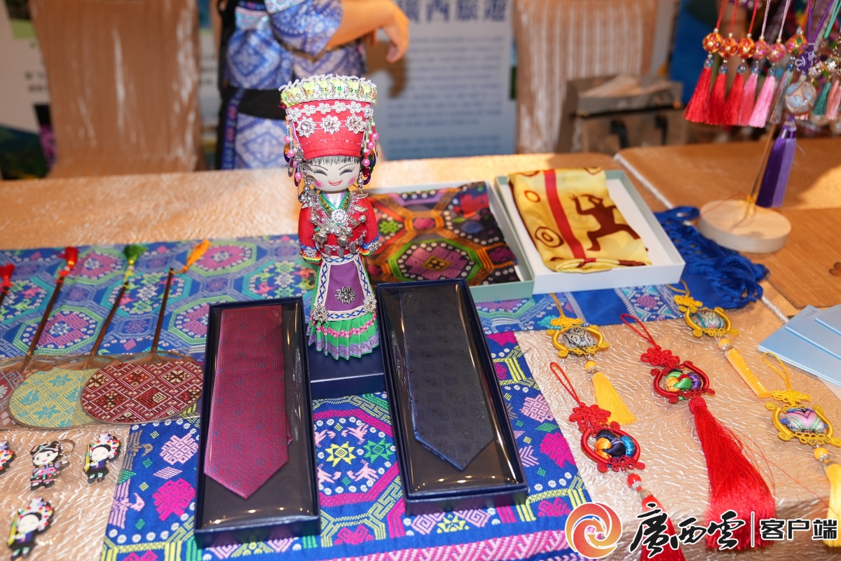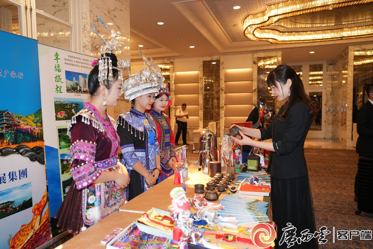 在广西旅游发展集团精心布置的展台前,身穿少数民族服装的女孩向嘉宾介绍广西秀美的山水风光、精美的文创产品,歌手弹唱着广西山歌,吸引了众多嘉宾。