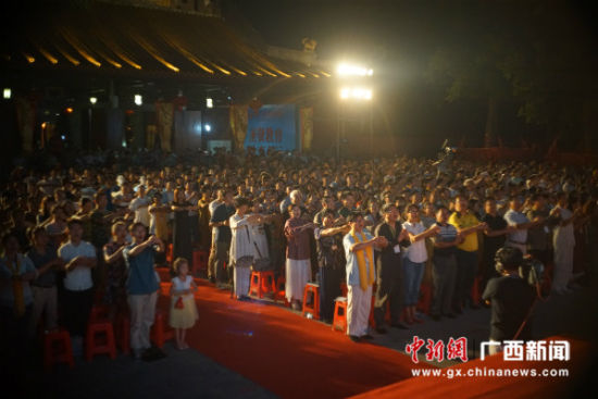 中新网南宁10月1日电(记者 林浩)“圆梦中国”中华文艺公益晚会近日在南宁孔庙上演,晚会现场,灯光灿若星河,把孔庙大成殿里古色古香的大背景舞台衬托得庄严夺目。该活动为2016中国-东盟(南宁)孔子文化周系列活动之一。