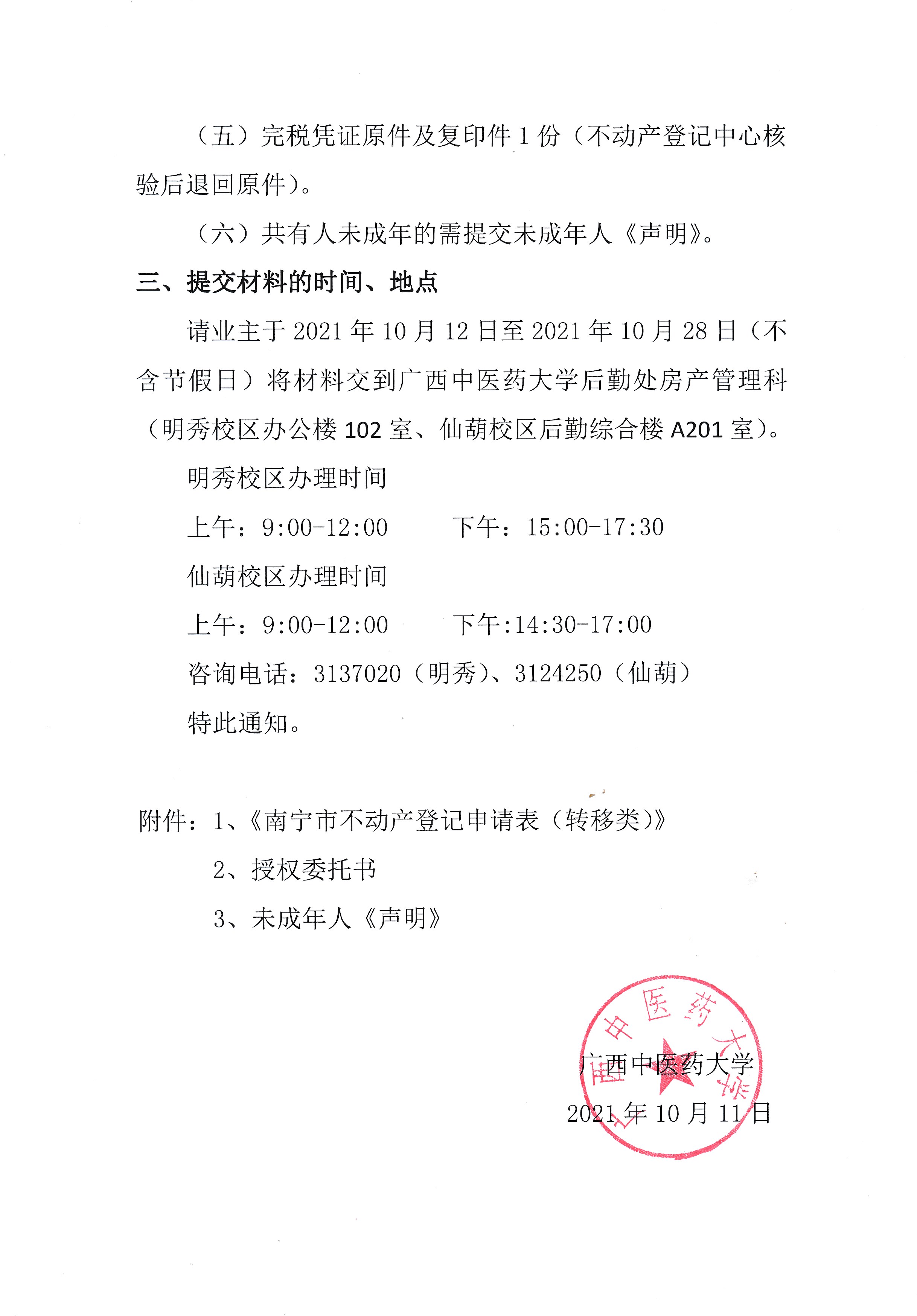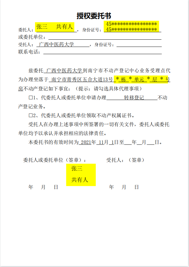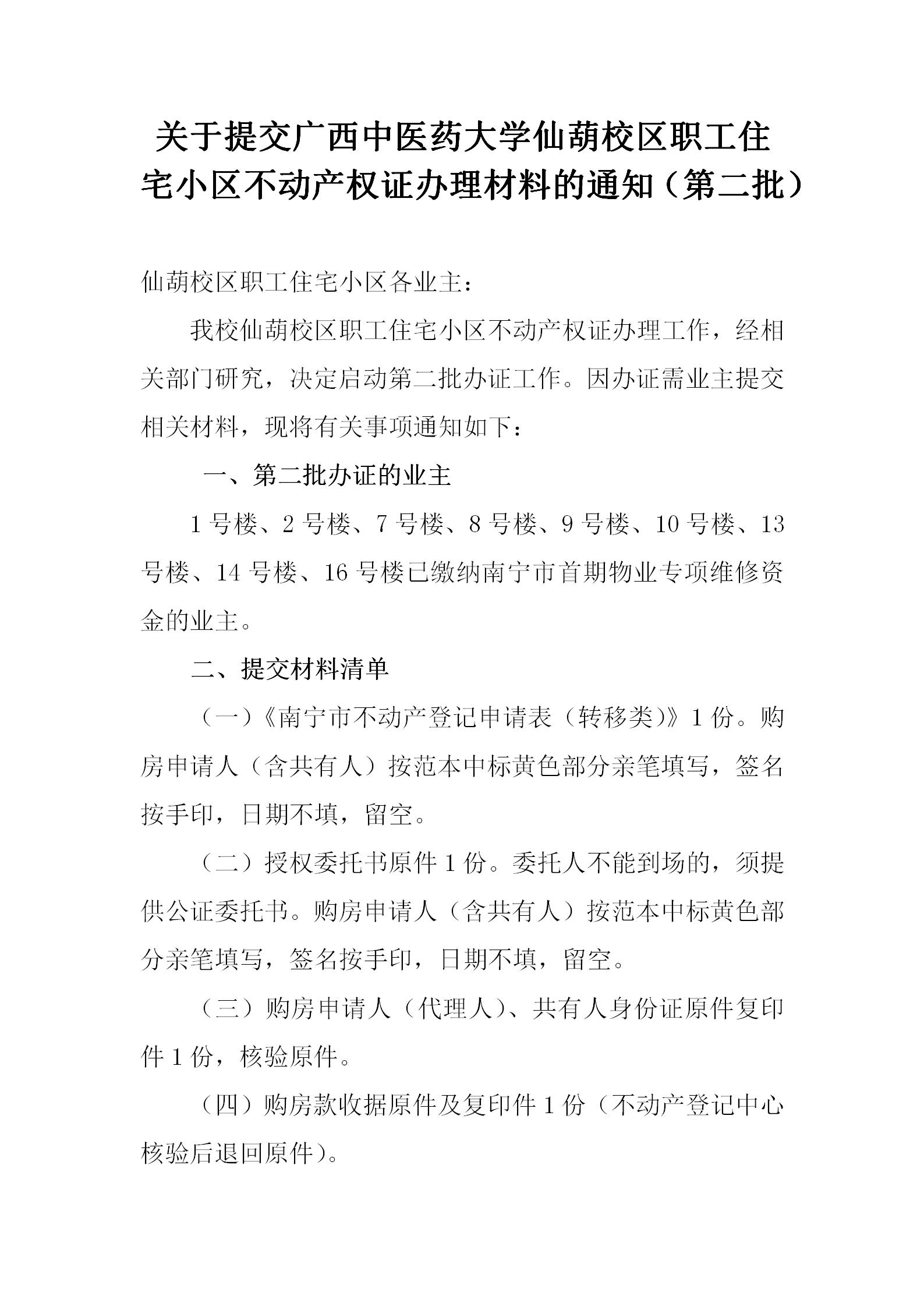 关于提交星空彩票老版本下载仙葫校区职工住宅小区不动产权证办理材料的通知(第二批) 日期:2021-10-12 点击数: 次 分享到: 附件1.南宁市不动产登记申请表(转移类)空白表.pdf附件2.授权委托书.docx附件3.未成年人(声明).docx 打印正文 关闭本页
