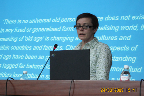 詹妮思博士是英国伍斯特大学健康与社会学院的硕士课程领导人。本次讲座由詹妮思博士全程使用英语进行演讲,她主要围绕当前英国老年护理服务模式的发展、注册护士如何提高对老人的服务质量、如何分析和应对老年人跌倒现象及如何护理老年痴呆症病人等多个方面进行讲解。