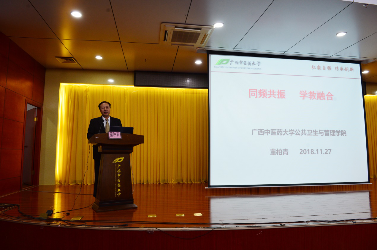 11月27日,公共卫生与管理学院院长董柏青教授,在图书馆第二会议室做了“同频共振,学教融合”的专题讲座。讲座由学院党委书记李怀泽主持,学院全体师生参加。
