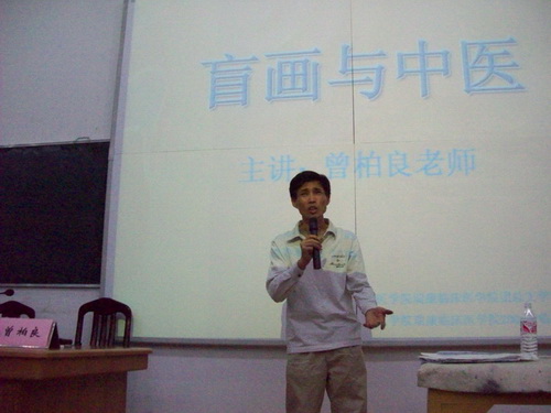 讲座之始,通过观看凤凰卫视《鲁豫有约》栏目对曾柏良老师的专题采访,使大家对曾老师有了更进一步的了解和认识。在接下来的讲座,曾老师用生动幽默的语言,讲述了自己从事盲画工作的缘由和乐在其中的体味,阐述了中国儒、释、道文化的精髓所在,涵盖了哲学、美学、心理学、文字学和医学等多个学科,精彩典故随手拈来,娓娓道出别是一番极致,并由此引申到中医文化,表达了自己对于包括中医在内的四大国粹的仰慕,以及对国学的由衷钦佩。他强调说“内心的定力胜出外界的业绩”,希望中医生能自强不息,潜心学习,赢得满室喝彩,博得不断掌声。