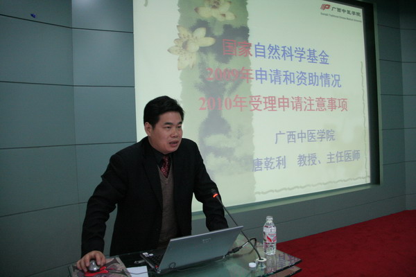 2009年12月10日上午,“2010年度国家自然科学基金申报动员会暨申报辅导”专题讲座在学院会展中心多功能厅举行。广西中医学院副院长冷静教授做了主题发言,科技处处长唐乾利教授作了2010年度国家自然科学基金的申报辅导专题讲座。动员会由科技处副处长覃振林副研究员主持。