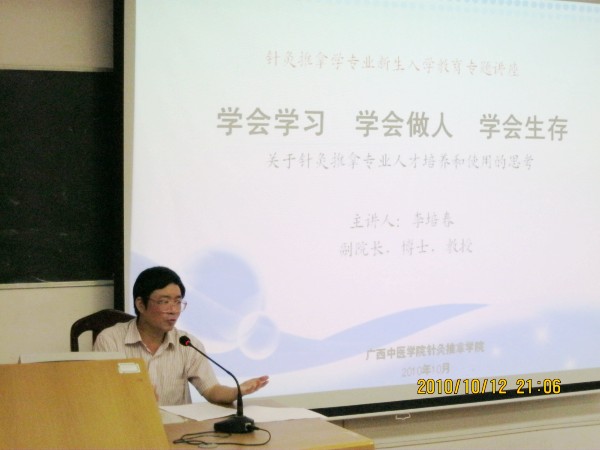 2010年10月12日晚,广西中医学院针灸推拿学院在我院西梯二教室举行了针对针灸推拿学专业新生,关于“针推专业人才培养和使用的思考”的入学教育专题讲座。针灸推拿学院有幸请来广西中医学院副院长李培春博士、教授,进行本次讲座。此次讲座以“学会学习、学会做人、学会生存”为核心内容。