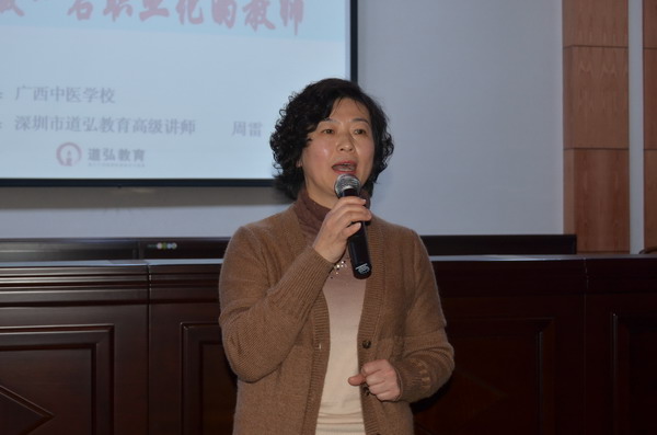 为进一步推进教师队伍建设,引导全体教职工构建合理的理论框架和能力结构,提升工作能力,广西中医学院护理学院邀请深圳市道弘教育集团高级讲师周雷老师于2012年2月21日在广西中医学院第一附属医院学术会议厅举办了主题为“如何做一名职业化的教师”的专题讲座,护理学院岑家铭书记、吴彬院长、罗艺徽副书记、周琦副院长、高滨洋副院长、林原副院长等领导出席了本次活动。讲座由吴彬院长主持。