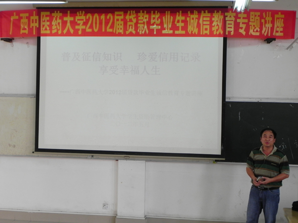 为增强助学贷款毕业生的信用意识,5月29日下午,学校国家助学贷款办公室主任、学生工作处副处长刘竑清在东梯二教室对我校2012届助学贷款毕业生进行诚信教育专题讲座。