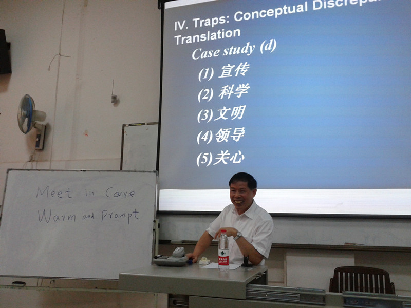 黄会长在讲解翻译当中一些常见词在不同的语境下的译法