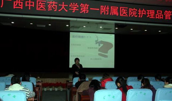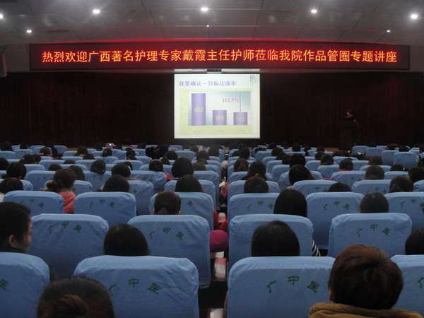 “品管圈”(Quality Control Circle,缩写QCC)是由相同的、相近或互补之工作场所的人们自动自发组成数人一圈的小圈团体(又称QC小组),然后全体合作、集思广益,按照一定的活动程序来解决工作现场、管理、文化等方面所发生的问题及课题。为进一步提高护理人员参与质量管理意识和解决问题能力,创新服务模式,确保医疗安全,一附院护理部将启动品管圈(QCC)活动作为今年的护理工作重点之一。在医院领导的大力支持下,2013年2月21日晚,广西著名护理专家戴霞主任护师莅临医院作品管圈(QCC)知识的专题讲座,500余名护理人员到会聆听,护理部韦衡秋主任主持了专题讲座。
