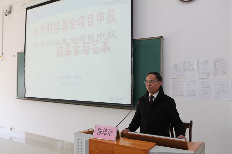 2013年12月19日下午,我校在仙葫校区2栋301教室举办了第七期科研能力提升讲座,主要针对我校从事社科类科研与教学的老师和研究生,以期提升我校社科类研究的科研水平。南宁学院副校长陈雄章教授受邀莅临我校,为师生带来了题为“社科基金项目申报的要素与艺术”的精彩报告。讲座由科技处岳桂华副处长主持,科技处钟振国处长、人文社科学院韦兆钧院长、王碧艳副院长、部分老师及学生共100余人参加了讲座。