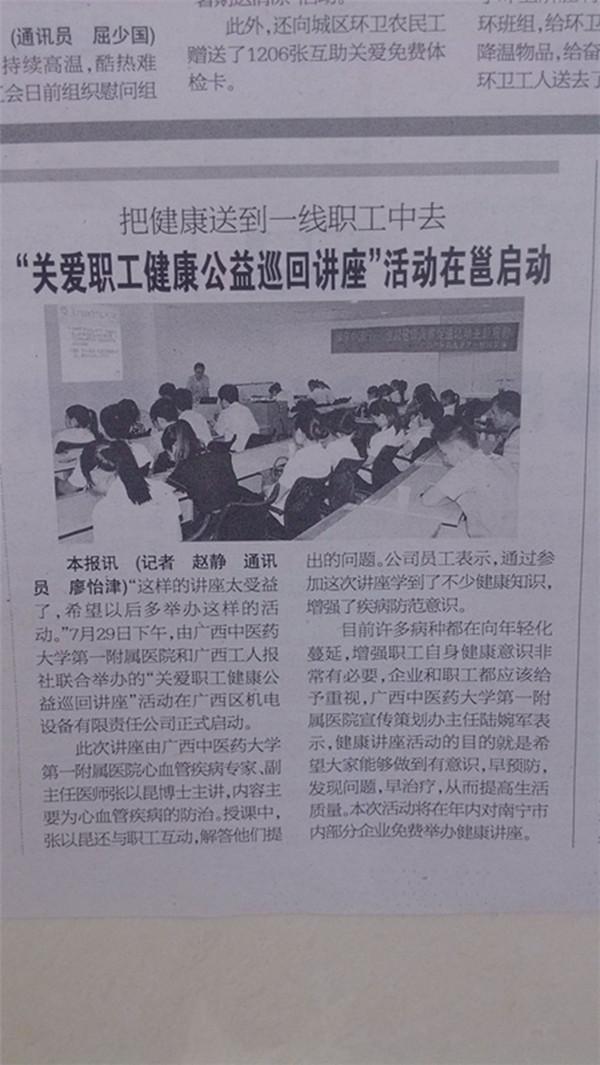 本次活动也是一附院与广西工人报社联合举办的“关爱职工健康公益巡回讲座”活动的第一站。今后将继续在南宁市内对部分企事业单位免费举办健康讲座,力求为更多单位的一线职工送去健康知识,送去健康保障。广西工人报对本次活动进行了新闻报道。