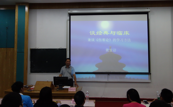 讲座吸引了众多中医爱好者,现场座无虚席。黄家诏教授从中医的出路在临床、关于经典、如何读经典、如何读《伤寒论》以及如何做临床等五个方面进行论述。黄教授指出,读经典,要着重领会其精神实质,“读古人之书,不得死于句下”;读经典,贵在学习古代医家的辩证思维方式,并试举了何应秋,金寿山,刘渡舟,李克绍以及医圣张仲景的学习经典的方法。黄教授还从《伤寒论》的文法特点,写作体制以及辩证方法和治疗规律等方面给同学们讲述如何学习《伤寒论》。同学们边认真听边做笔记,讲座结束后,大家还与黄教授作互动交流。