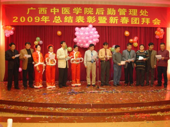 学院副院长李培春教授在会上做了重要讲话,何天富处长作2009年后勤工作报告。会上还对后勤先进集体、先进个人进行表彰,并开展了由后勤管理处职工自编自演的文艺表演及趣味活动。学院领导及有关部门领导出席了此次新春团拜会,对一年来的后勤工作给予了肯定,并致以节日的祝福。